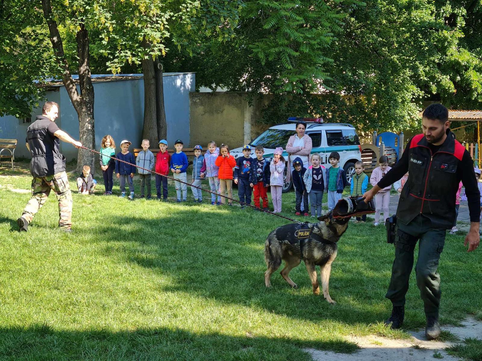 Egy májusi délelőtt a komáromi rendőrkapitányságról 2 rendőr bácsi és négylábú barátaik látogatták meg az ovisokat. Elmesélték, hogy hogyan segítik a kutyák a rendőrök munkáját, mire képzik ki őket. Bemutatójuk során láthattuk, a parancsra helyben maradást, akadály átugrást, ellenségre támadást, ellenség megtalálását ugatással jelezve. A gyerekek ámulattal nézték a rendkívül okos rendőrkutyák és gazdáik összehangolt munkáját. Továbbá nagy élményt jelentett a gyerekeknek az is, hogy beülhettek a rendőrautóba és közvetlenül beszélgethettek a rendőr bácsikkal, feltehették kérdéseiket.