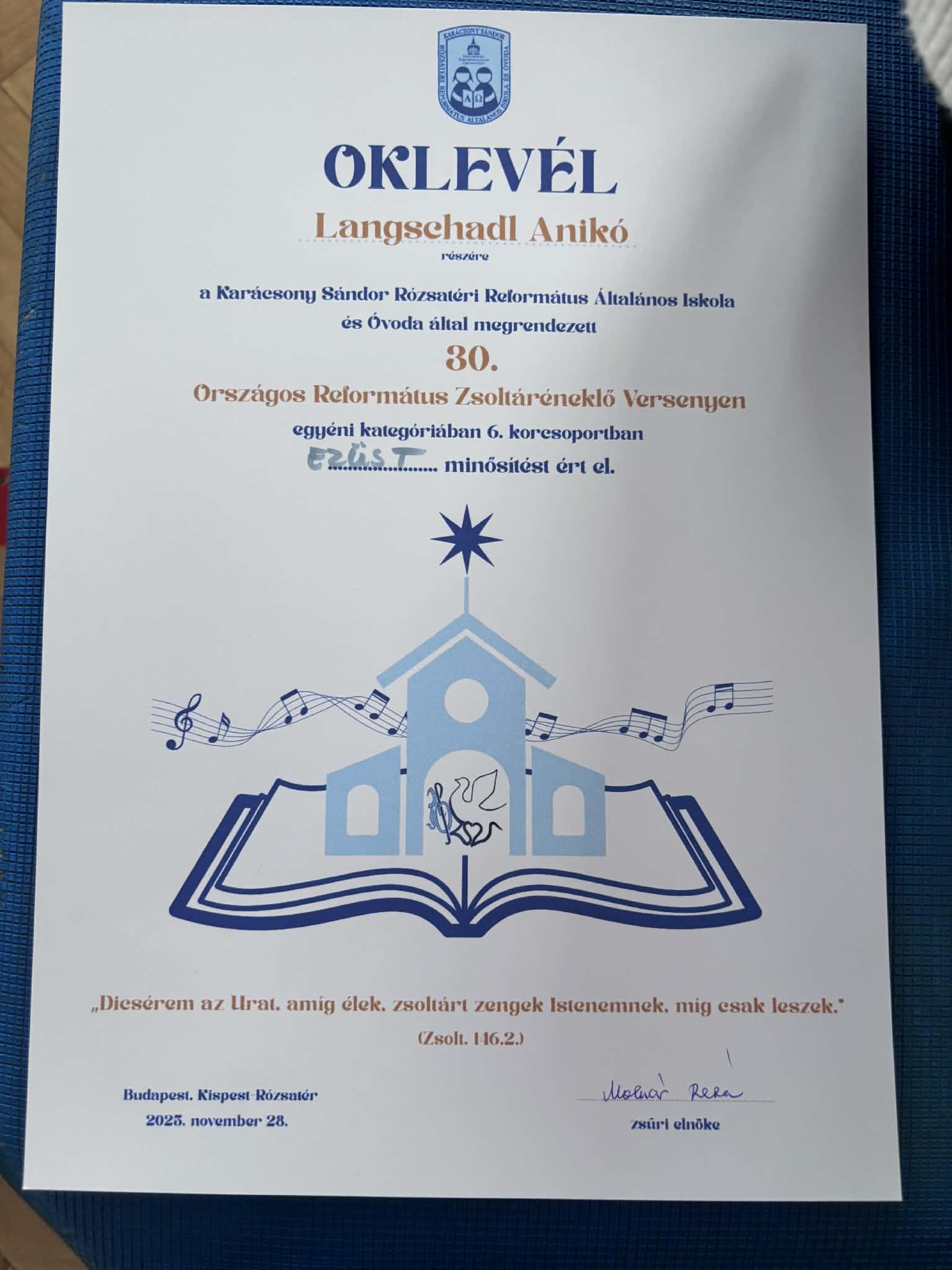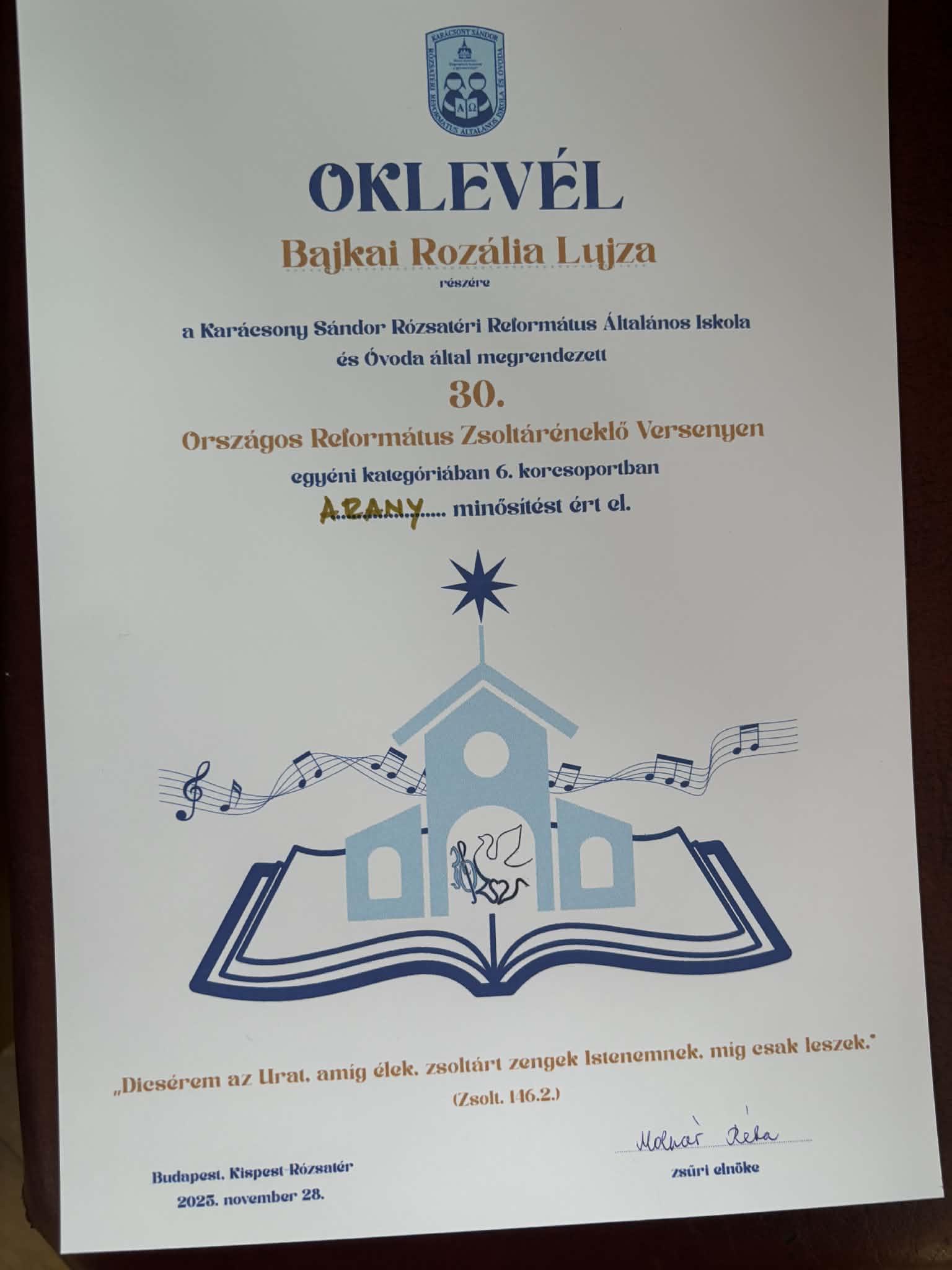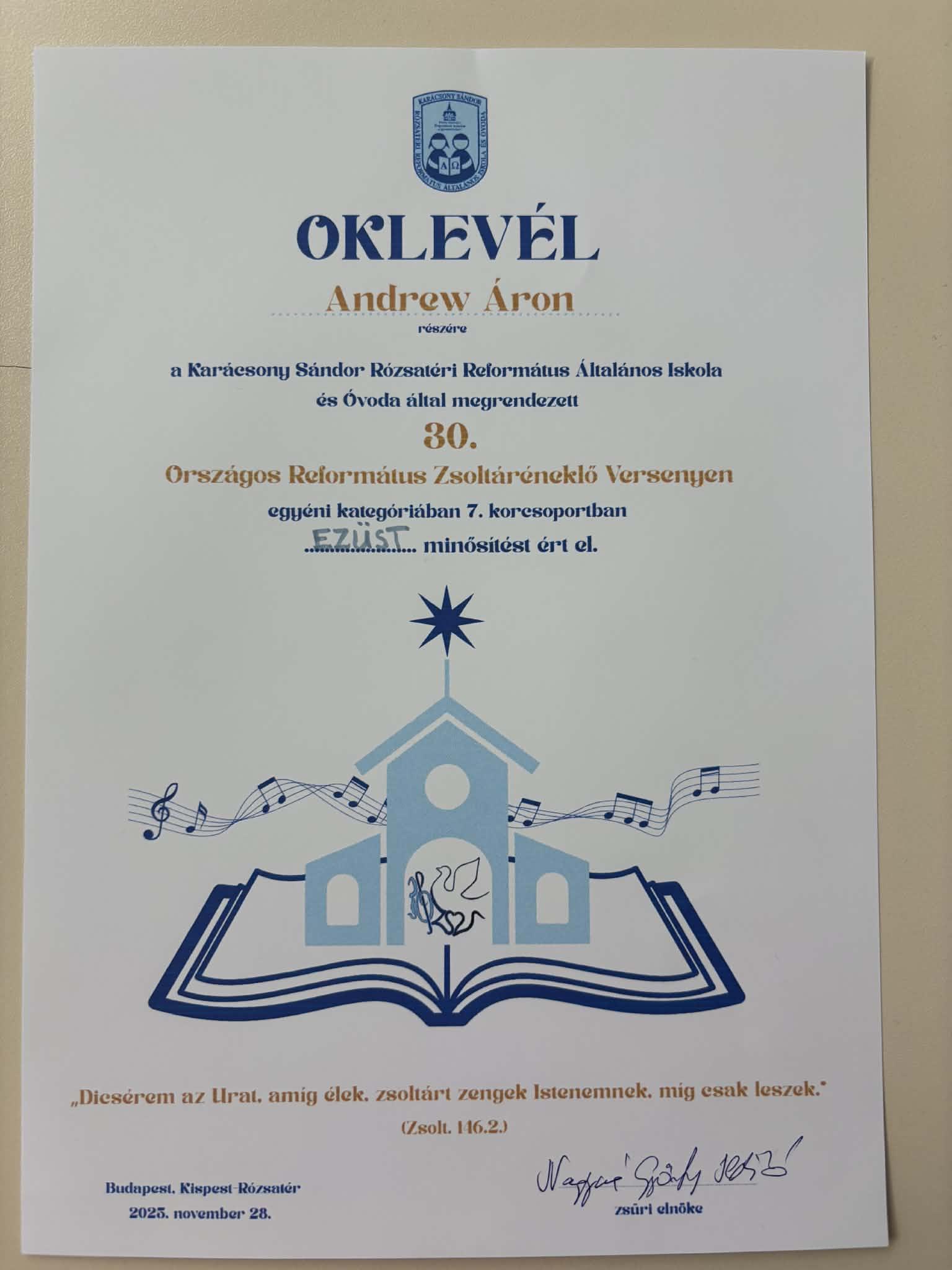 2025. november 28-án Budapesten a Karácsony Sándor Rózsatéri Református Általános Iskolában és Óvodában 44 iskola diákjai versenyeztek 8 kategóriában. A Felvidéket Bátorkesziről és Komáromból képviseltük. A Marianum Egyházi Iskolaközpontból 3 diákunk mutatta be énektudását. 2 kötelező és 1 választott zsoltárt kellett
