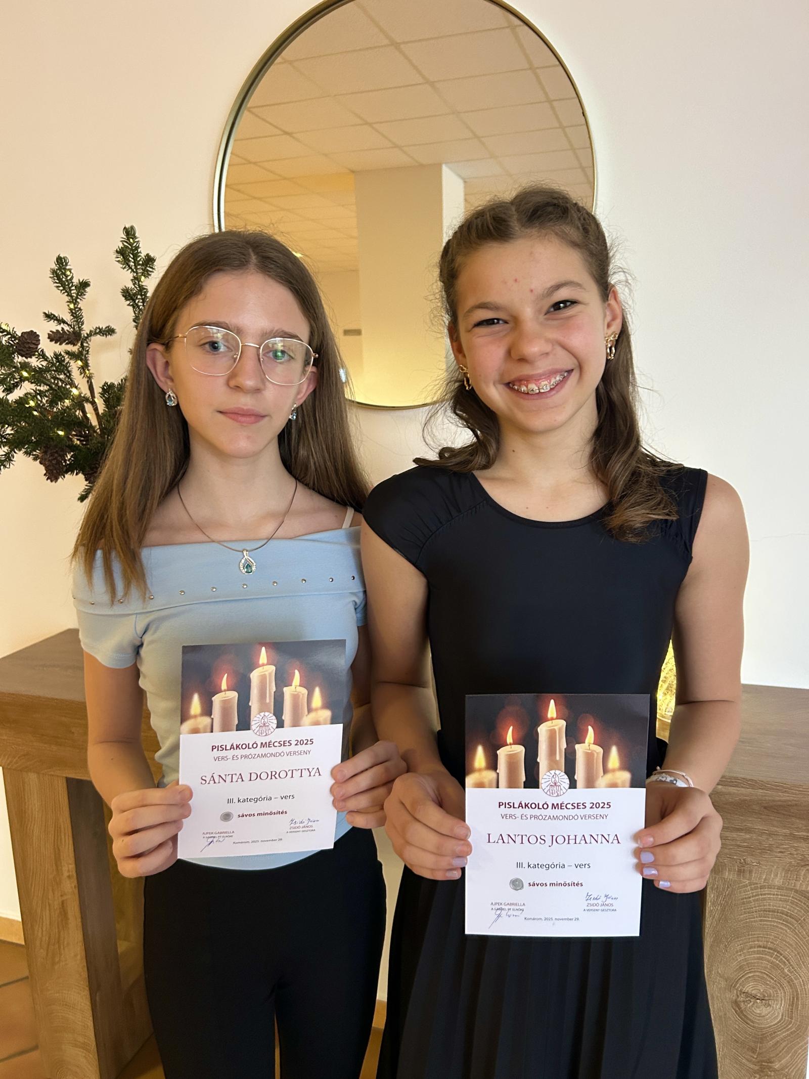 Idén is megrendezték a Pislákoló mécses vers – és prózamondó versenyt a Gábriel Polgári Társulás szervezésében. November 29-én népes gyermeksereg gyűlt össze a Selye János Egyetem Konferenciaközpontjában, hogy gazdagítsanak minden jelenlévőt a lelki vagy mély emberi értékeket képviselő irodalmi alkotások előadásával. Iskolánkat ezen az eseményen méltón képviselte két diákunk: Lantos Johanna és Sánta Dorottya a 7. A osztályból. Mindketten ezüstsávos minősítést kaptak. Gratulálunk nekik!